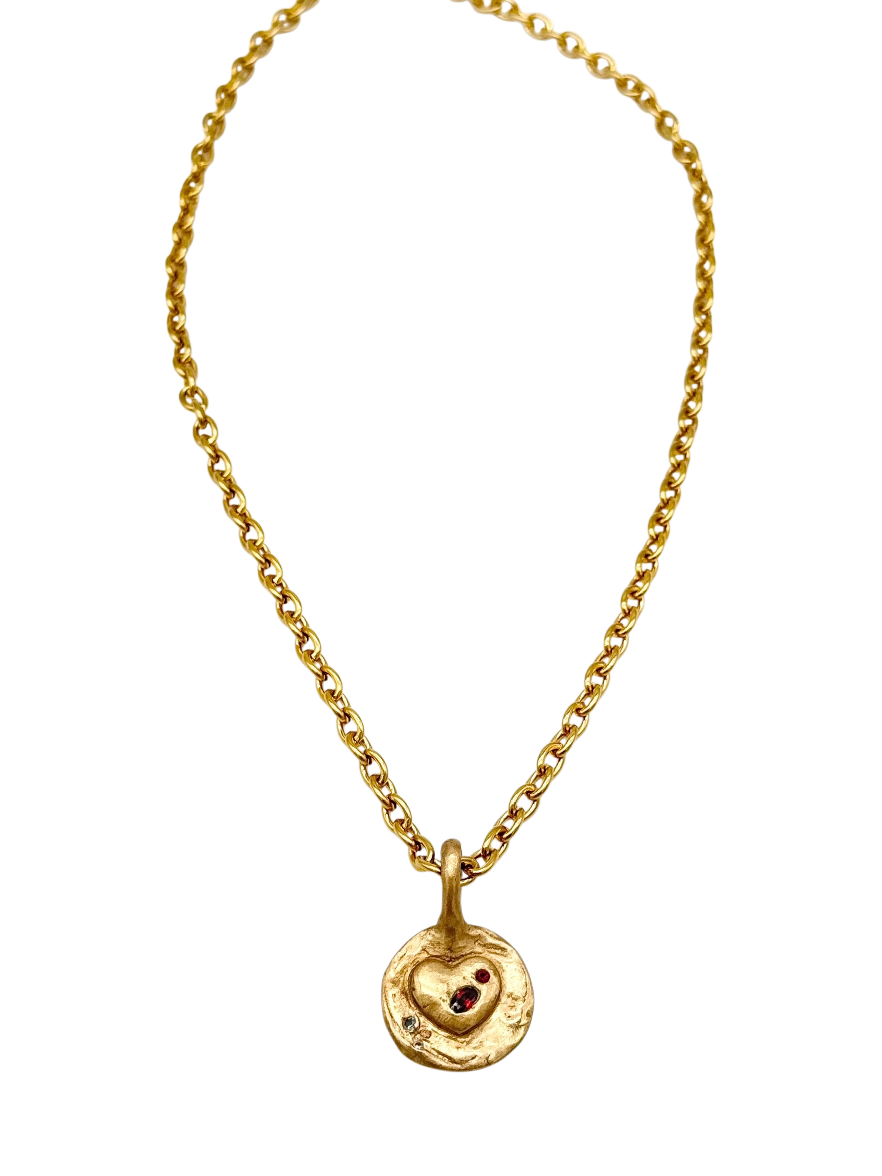 The Abrazo Necklace is a handcrafted bronze piece featuring a raised heart design that feels both intimate and symbolic. Accented with lab-created gems in varying sizes, it brings a touch of color and sparkle to a timeless form. A piece that captures the warmth of a heartfelt embrace. Includes a chain to complete the look.