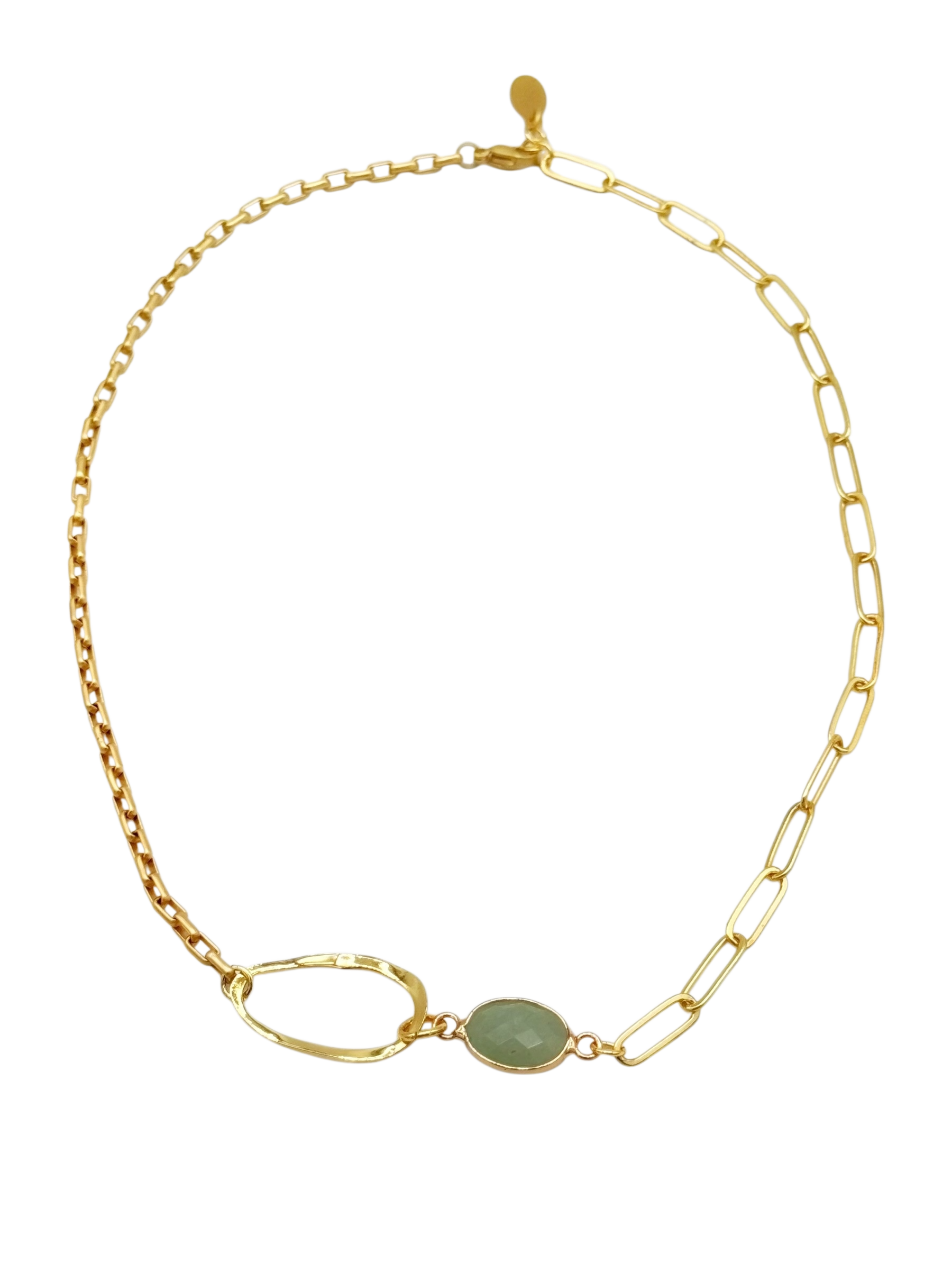 The Aventura Necklace is a handmade piece featuring a stunning Amazonite stone, set in gold plating. With a mix of textures, this unique design brings a bold and artistic touch, perfect for adding a refined yet striking element to any look.