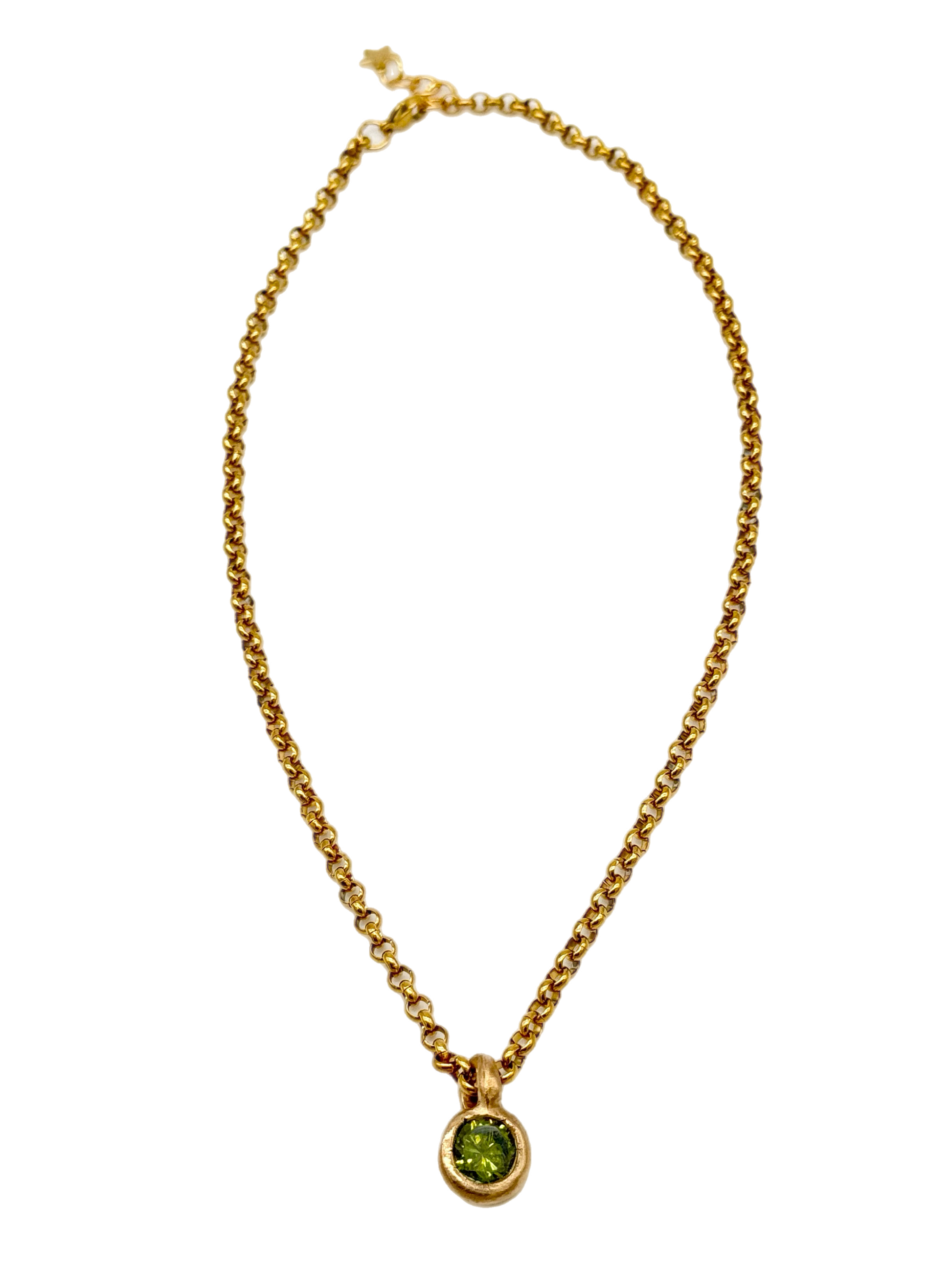 The Caramelo Necklace is a striking, handcrafted piece featuring a sculptural bronze pendant paired with a bold gold-plated chain. At its center, a lab-created prasiolite adds a fresh, vibrant pop of color, blending the beauty of a gemstone with an eco-conscious spirit. Perfect for those who cherish unique jewelry that tells a story and stands out.