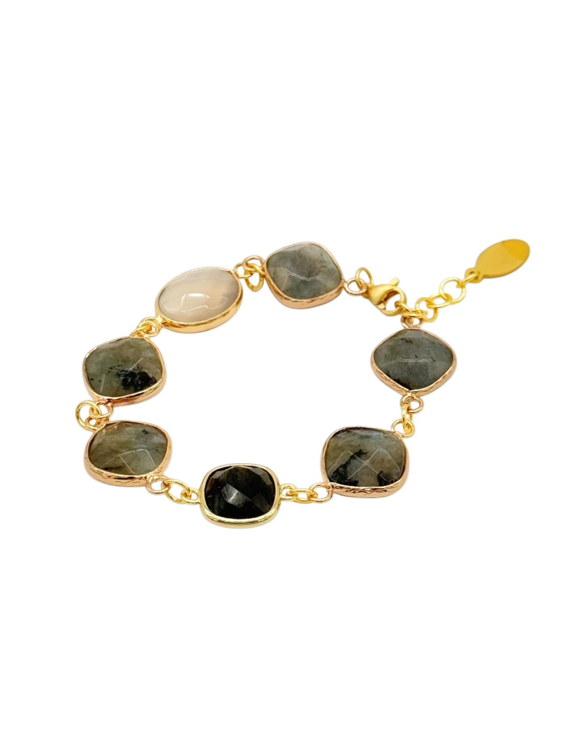 The Cuarzo Bracelet is a gold-plated piece filled with natural grey gemstones, with labradorites taking center stage. Its subtle shimmer and elegant tones make it a versatile accessory for any style.