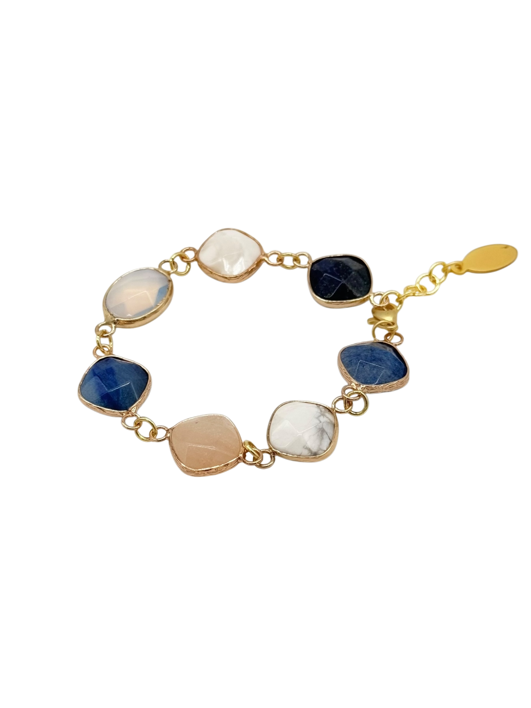 The Cuarzo Bracelet is a gold-plated piece featuring a beautiful combination of blue and white stones, highlighted by the rich hue of lapis lazuli. Its captivating colors and natural elegance make it a standout accessory for any look.