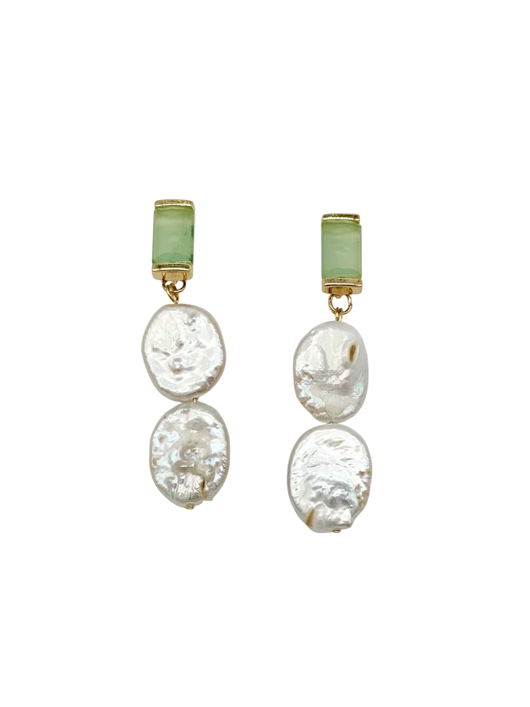 The Duo earrings are handcrafted and gold plated, featuring fresh green quartz paired with luminous river pearls. This elegant combination brings a natural, vibrant touch to the design, blending color and classic elements with effortless style.