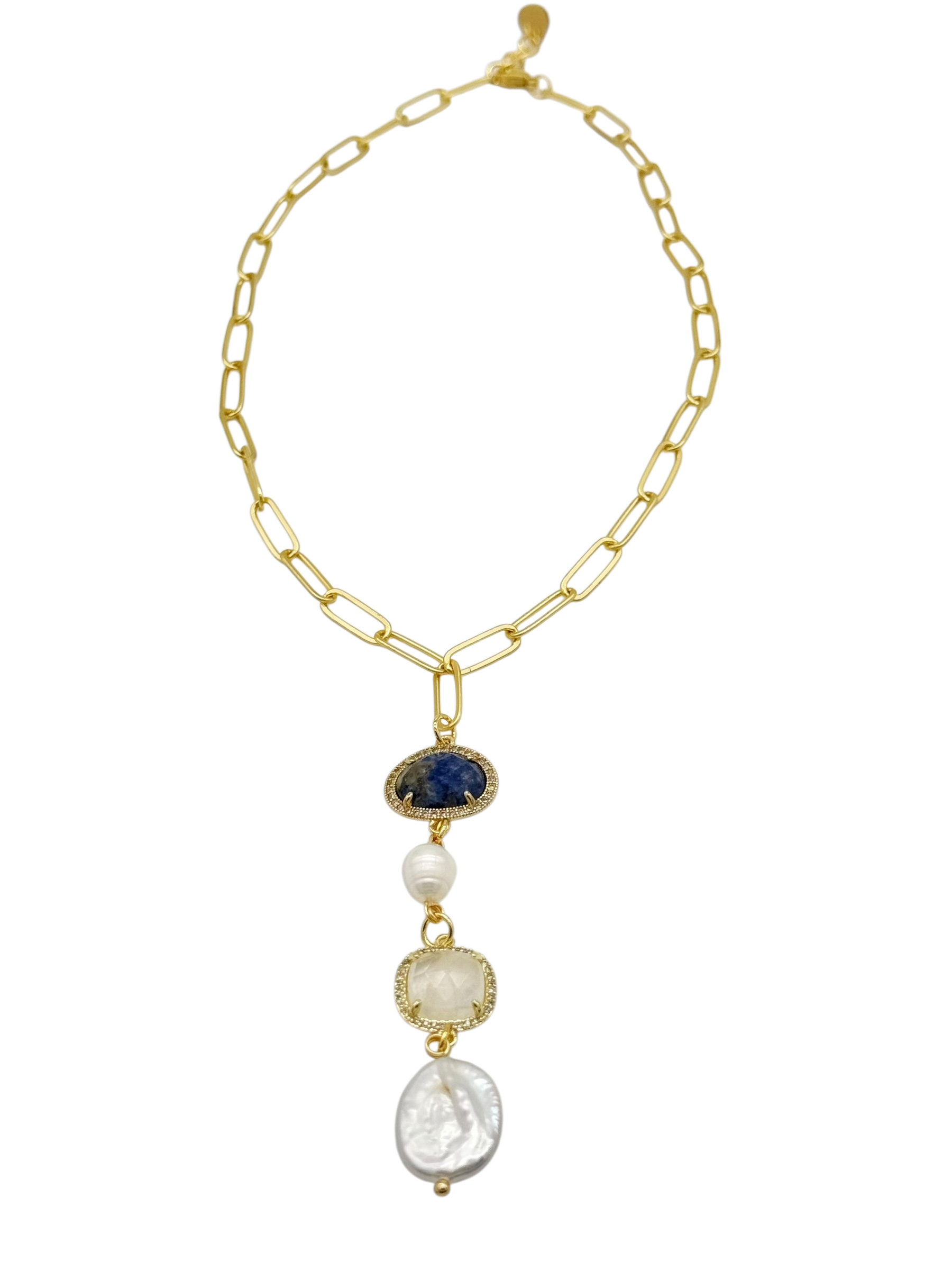 The Eclipse Necklace is a stunning gold-plated piece that captures the beauty of celestial alignments. Adorned with sparkling CZ, deep blue lapis lazuli, and radiant clear quartz, it’s a harmonious blend of elegance and mystery, perfect for elevating your style.