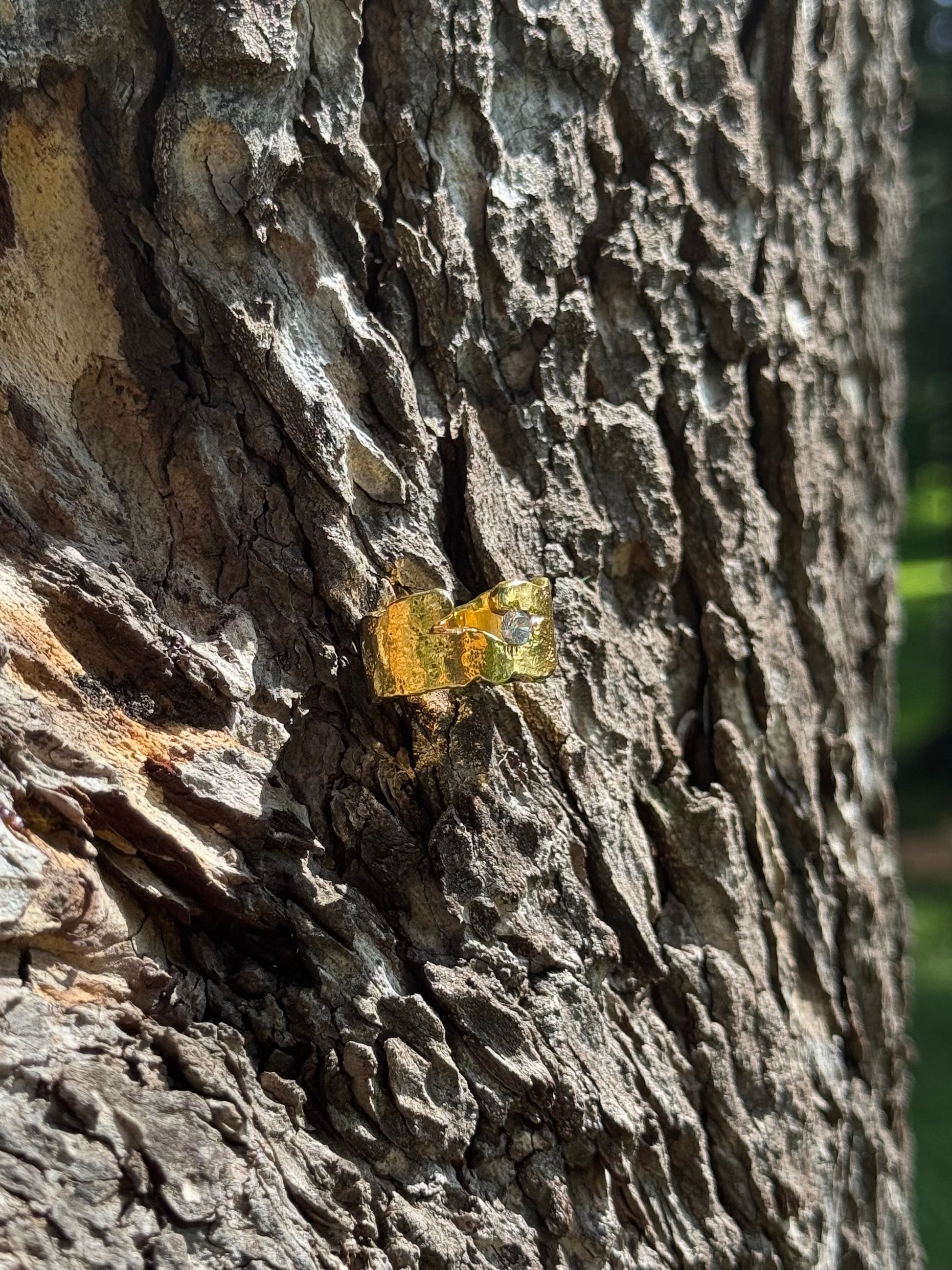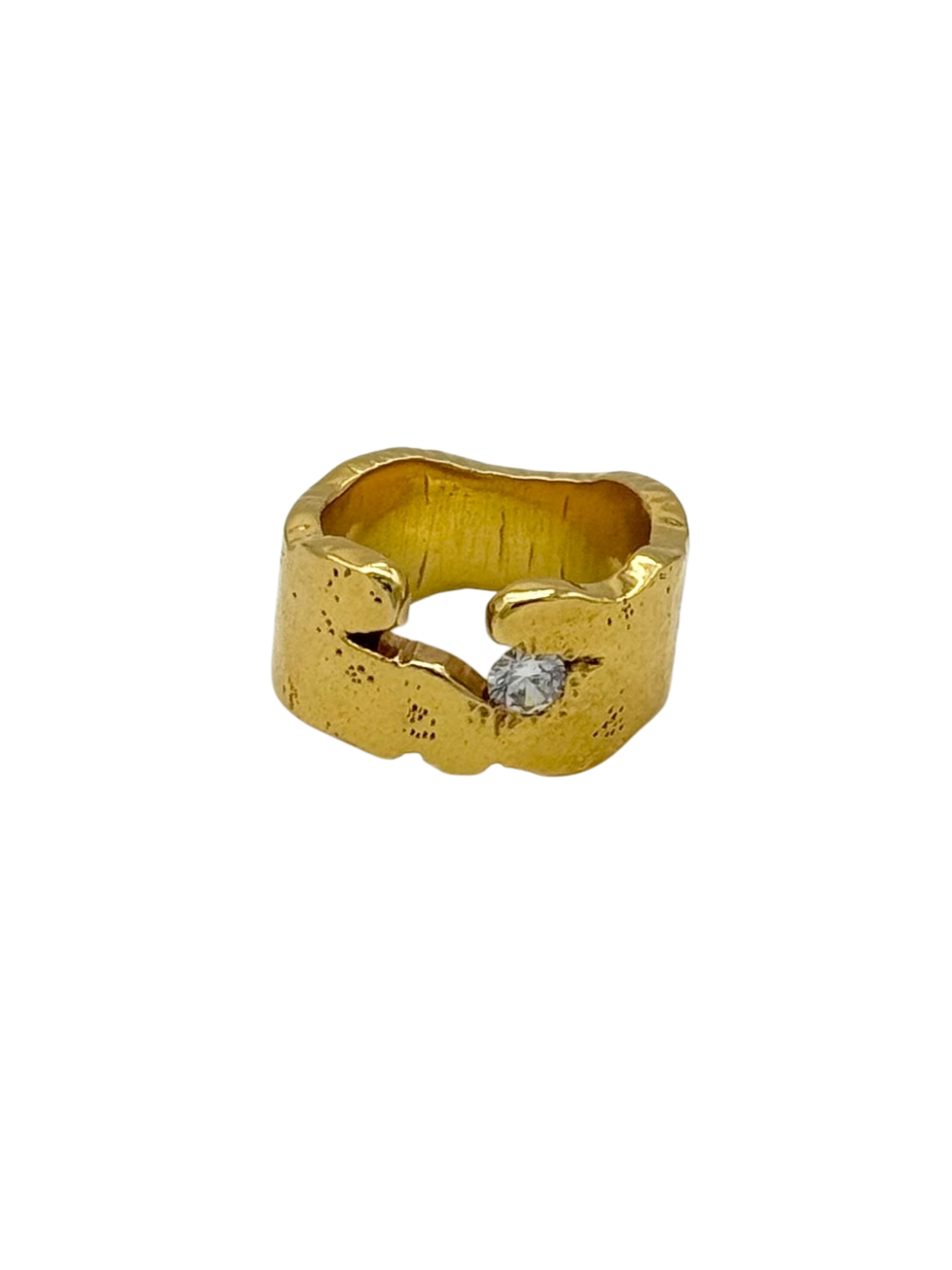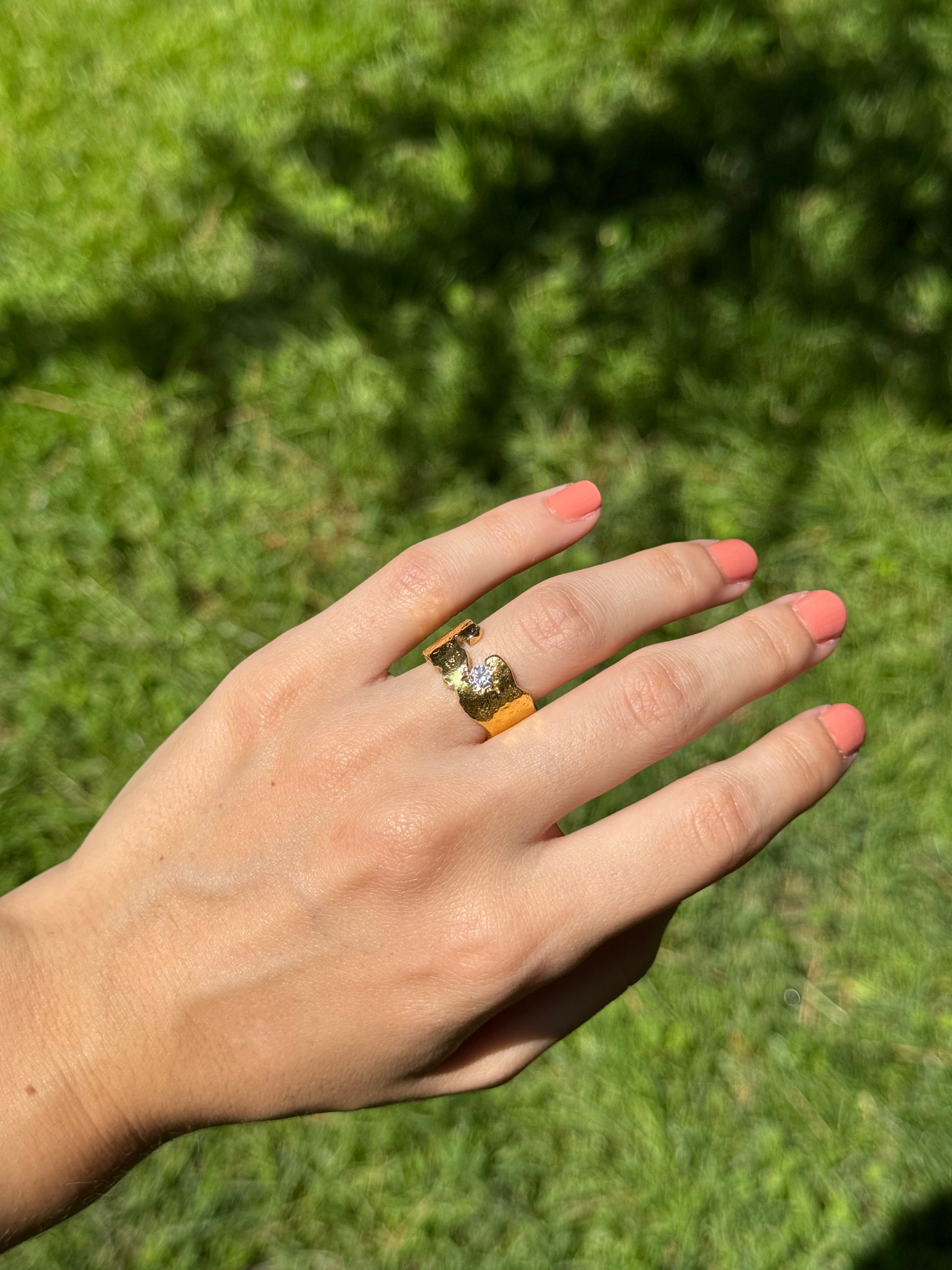 The Espacio Ring is a unique handmade piece featuring a distinctive design with a hollow space in the middle, showcasing a striking white gems. Its minimalist yet bold look makes it an intriguing accessory, perfect for adding a touch of elegance and mystery to any outfit.