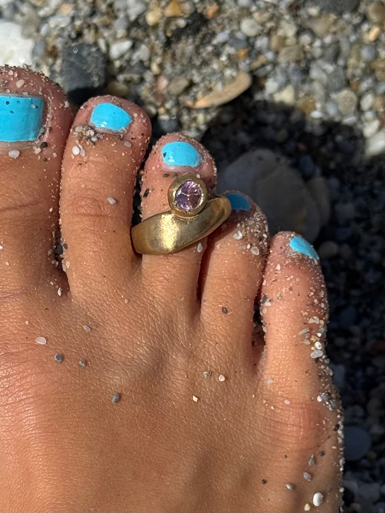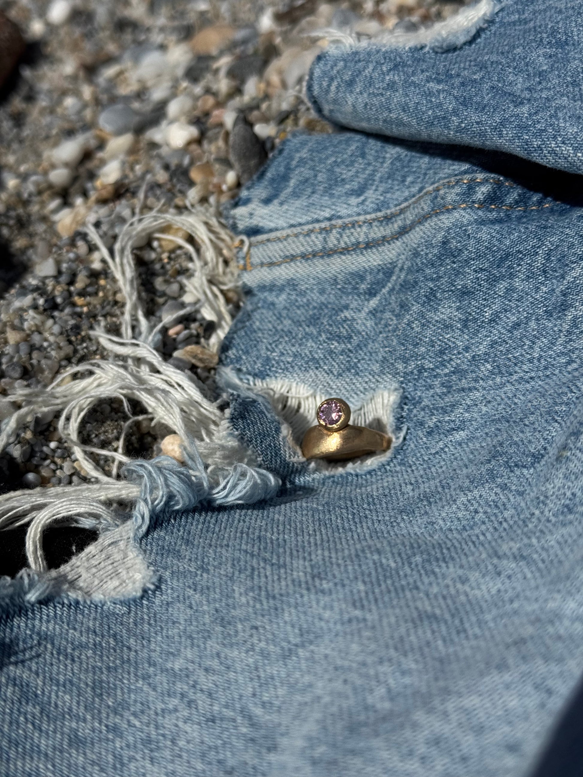 The Faro Ring is handmade in bronze and features a lab-created pink quartz that glows with soft, luminous tones. Its distinctive design makes it a versatile piece, perfect for wearing on its own or stacking to create your own unique style.