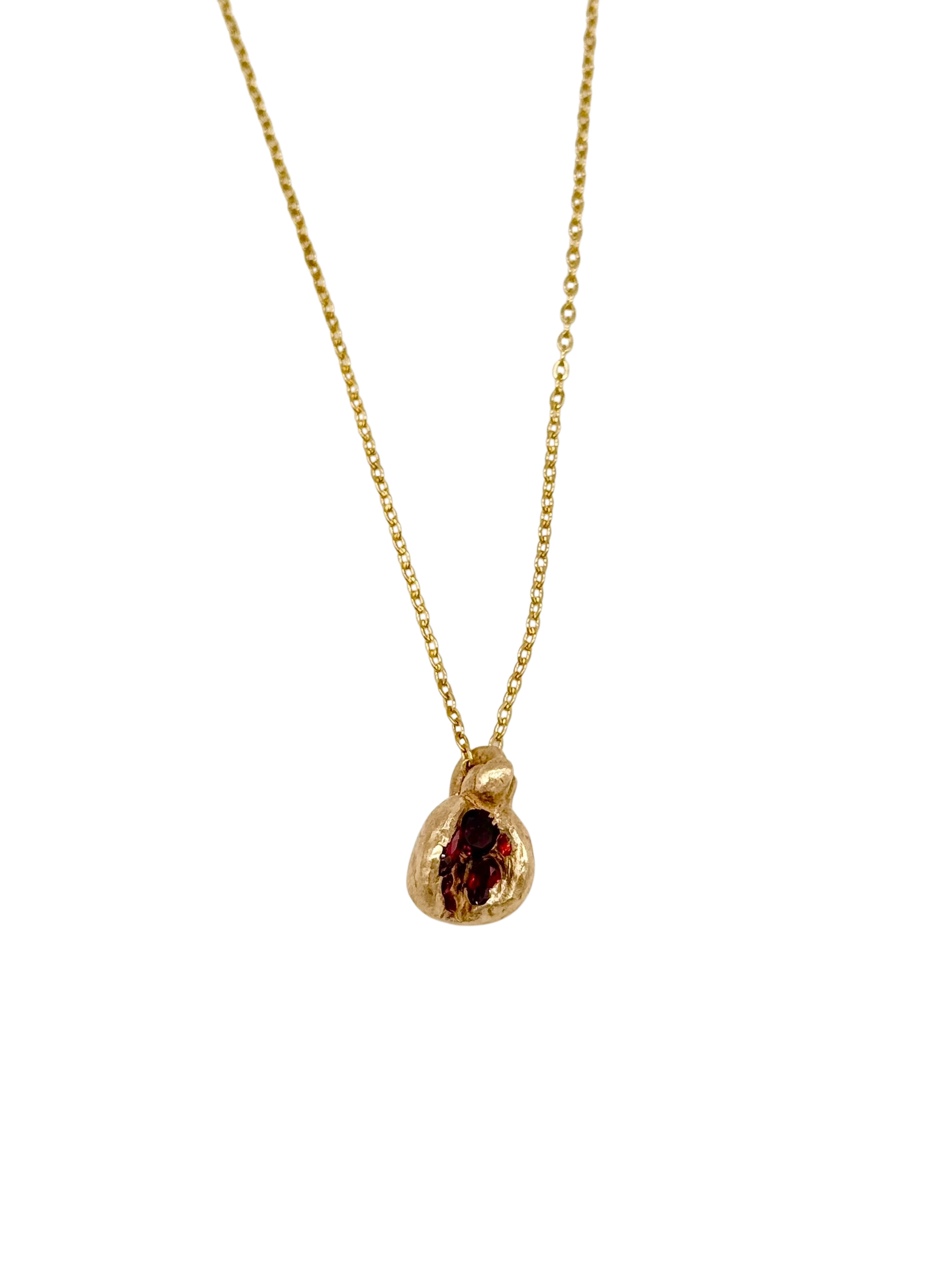 The Granada Necklace is a unique, handcrafted piece made from bronze, featuring an elegant arrangement of lab-created garnets in varying sizes. Its rich tones and organic composition make it a striking piece that feels both bold and refined. It includes a chain to complete the look, adding depth and warmth to any outfit.
