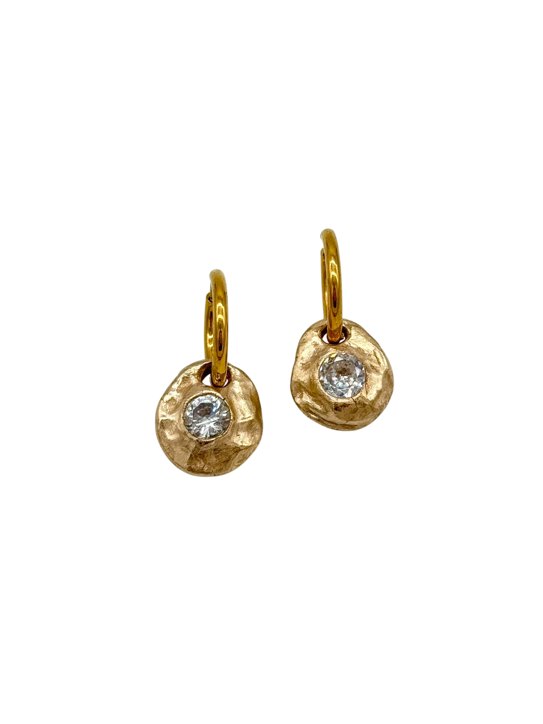 The Lago Earrings are handcrafted in bronze and set with radiant lab-created white gems. Featuring hypoallergenic hoops as a base, they offer a sleek and elegant look with all-day comfort and wearability.