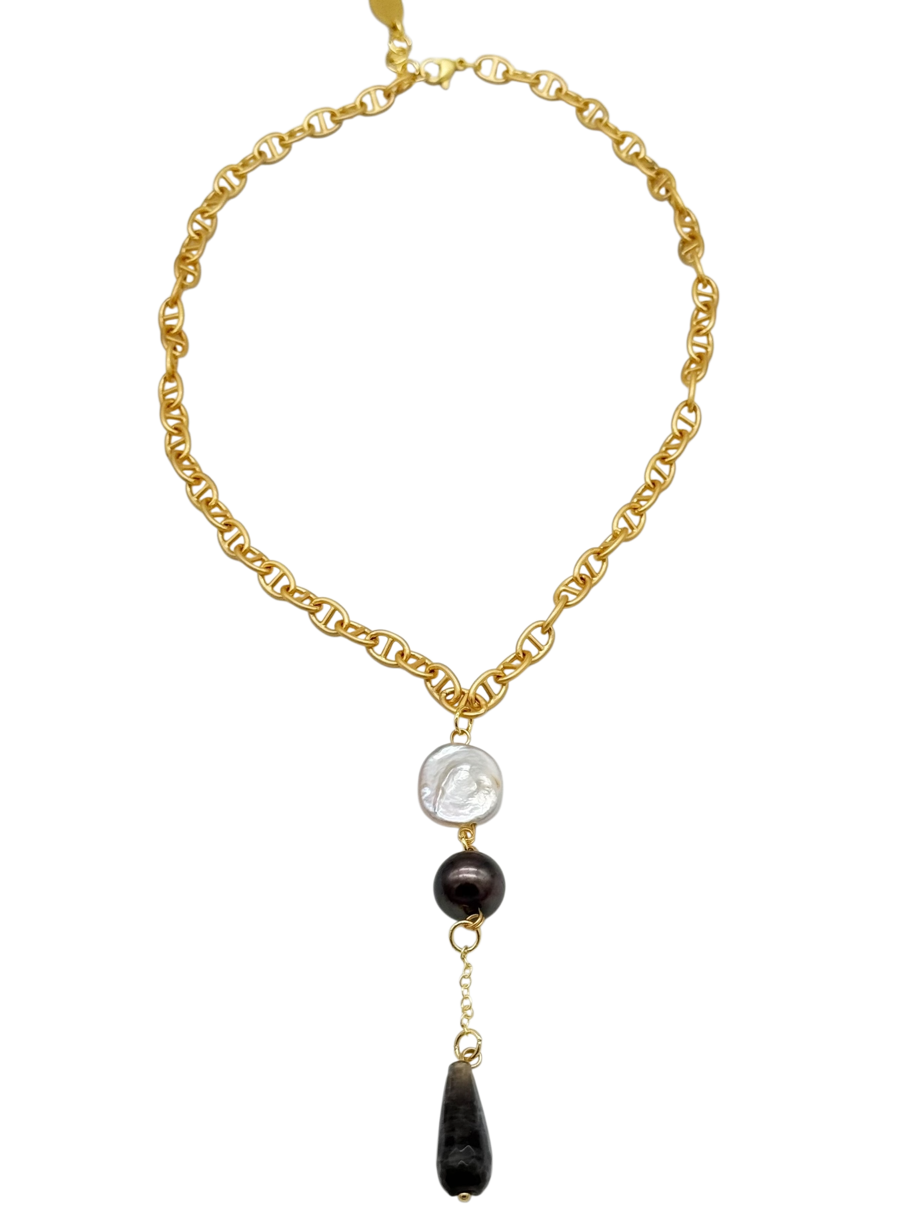 The Linea Necklace is a delicate balance of elegance and movement, crafted in gold-plated and adorned with luminous river pearls and enchanting labradorite. The interplay of textures and soft shimmer makes it a versatile piece, perfect for layering or wearing on its own as a subtle statement.