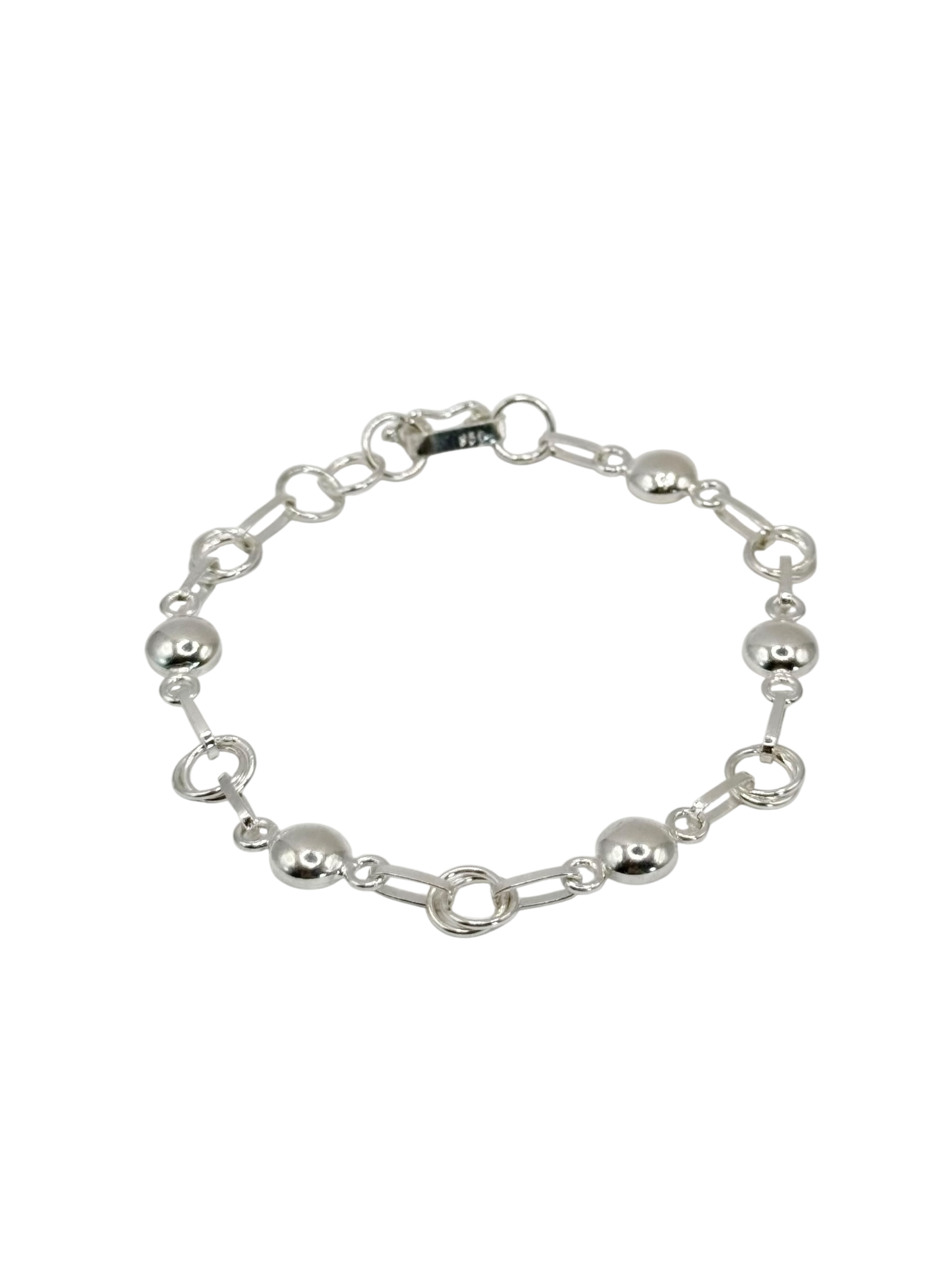 The Lunar Bracelet is an elegant design crafted from 950 silver, featuring delicate dot and circle details that resemble tiny moon craters. Its subtle yet unique style makes it a versatile accessory for any occasion.