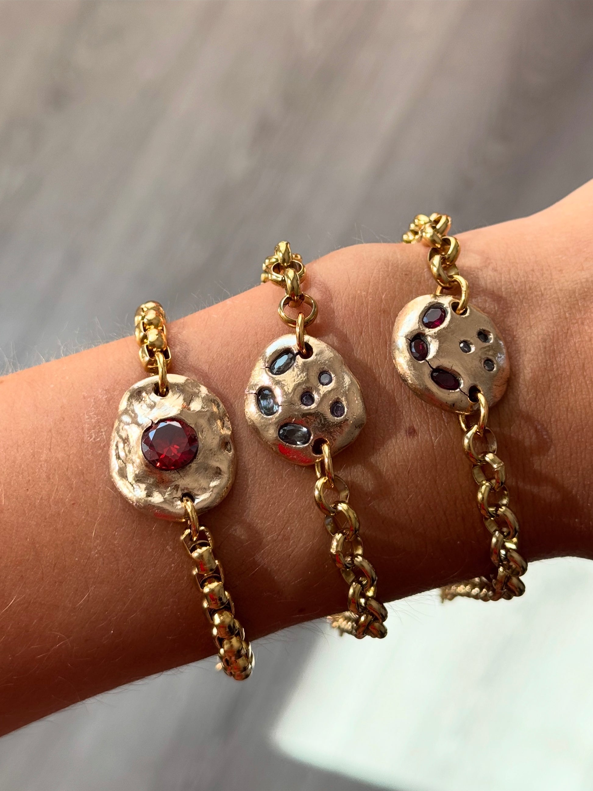The Manzana Roja Bracelet features a chunky gold-plated chain and a single handcrafted bronze link set with a vivid lab-created ruby. Bold and sculptural, the central link sits seamlessly within the design, adding a fresh pop of red and a touch of playful elegance to the piece.