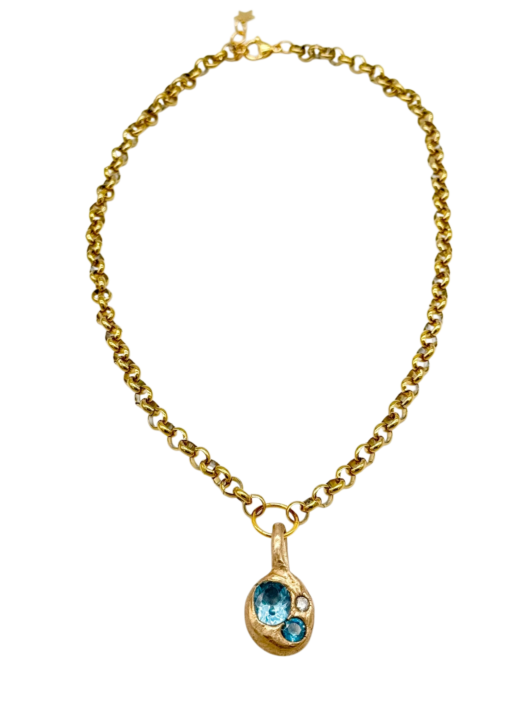 The Océano Necklace is a bold, handcrafted piece made in bronze. It features two lab-created aquamarines in different sizes, evoking the depth and movement of the sea, paired with a luminous white gem for contrast. Suspended from a gold-plated bold chain, this sculptural design brings together organic inspiration and modern elegance.
