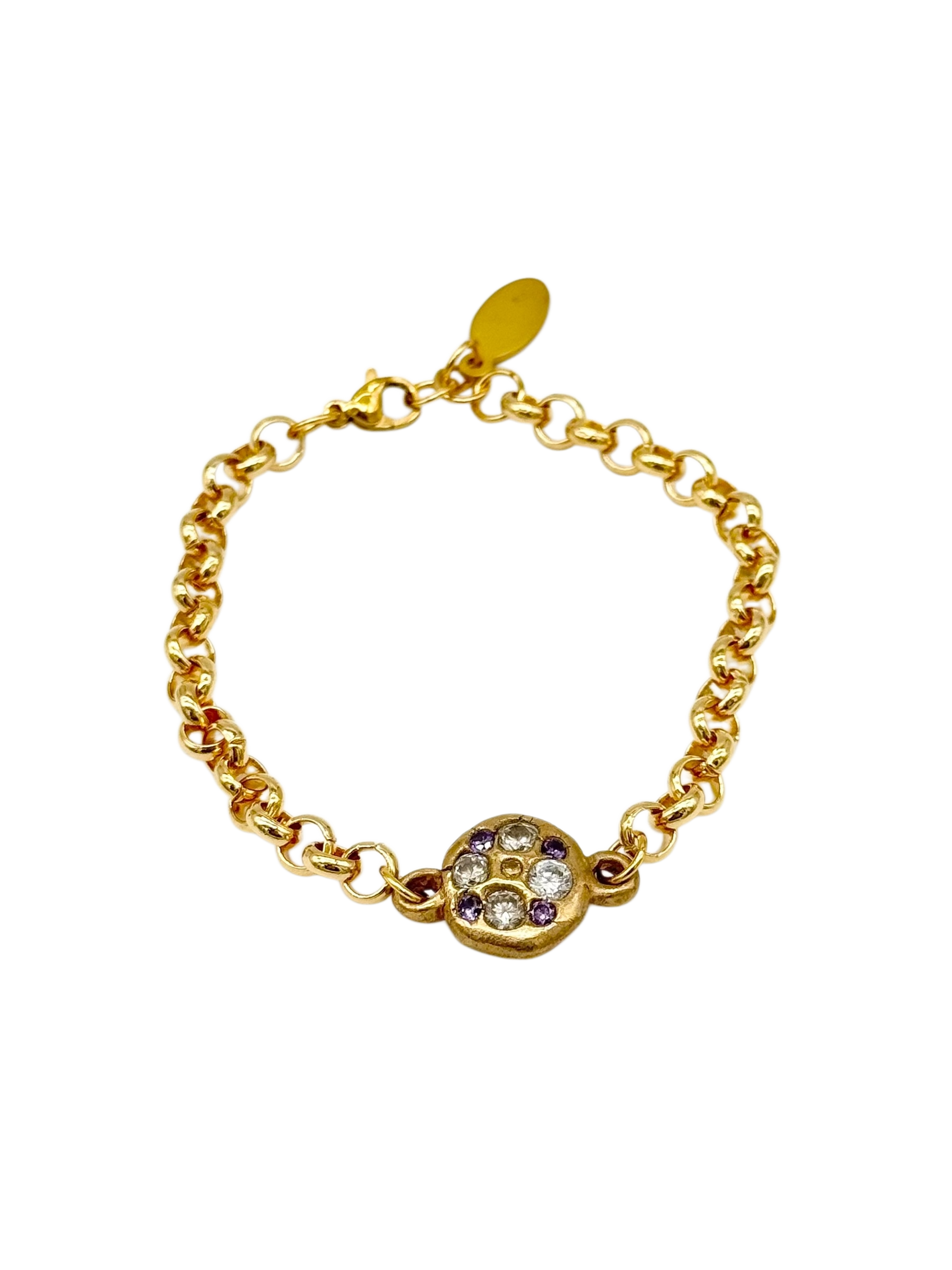 The Prisma bracelet features a handcrafted bronze link showcasing a vibrant design with four lab-created amethysts and four lab-created white gems arranged harmoniously. At the center, a small lab-created champagne quartz adds a warm glow. Suspended from a gold-plated chain, this piece radiates elegance and colorful brilliance.