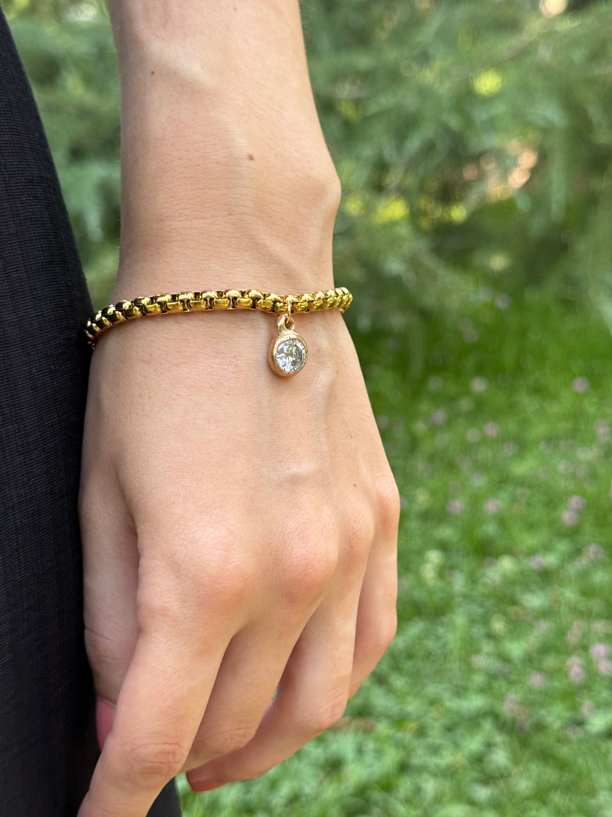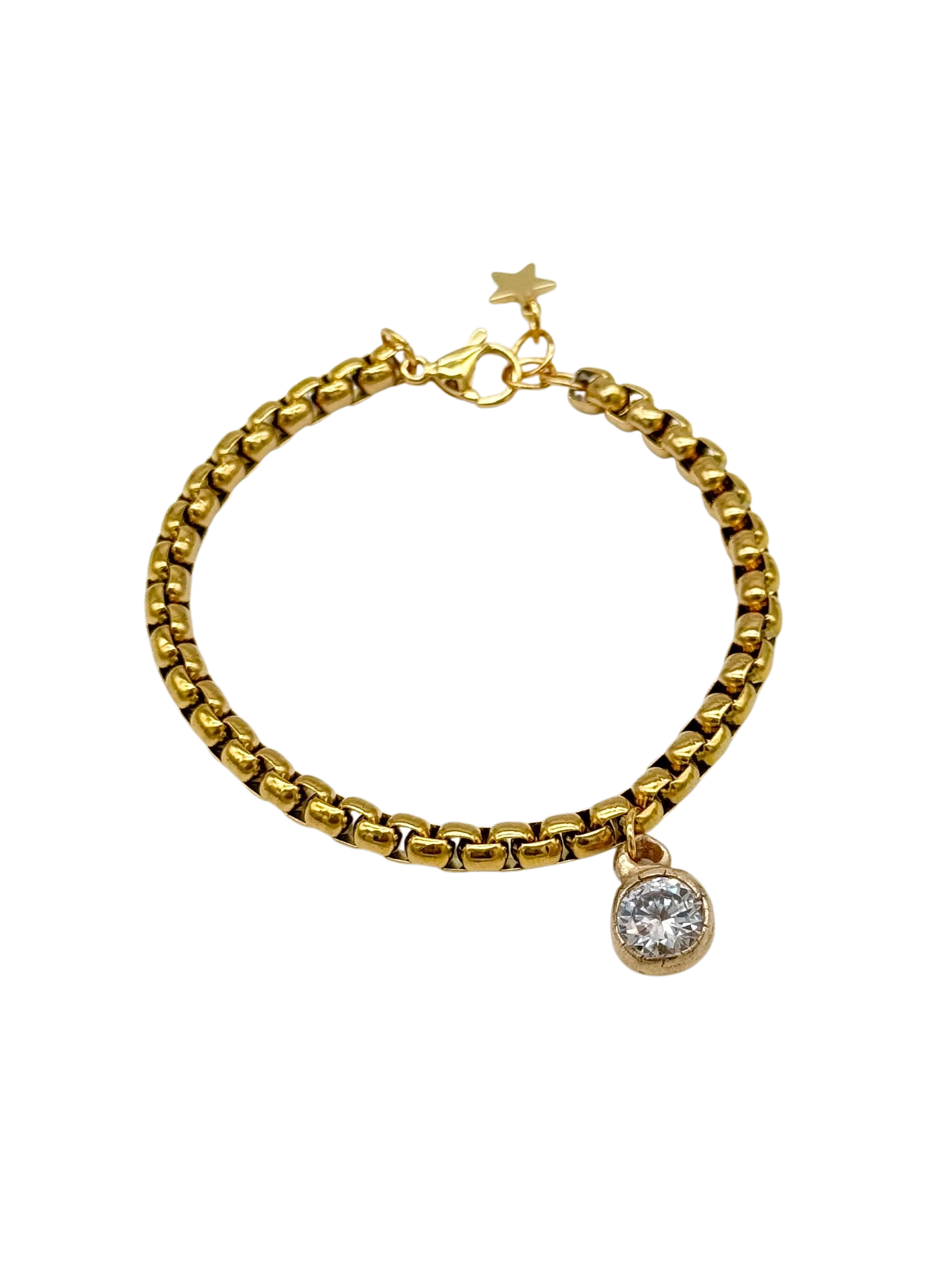The Punto Bracelet is a bold and expressive piece, featuring a chunky gold-plated chain and a handcrafted bronze pendant set with a luminous lab-created white gem. Eye-catching and full of character, it brings a statement-making touch of light and strength to any look.
