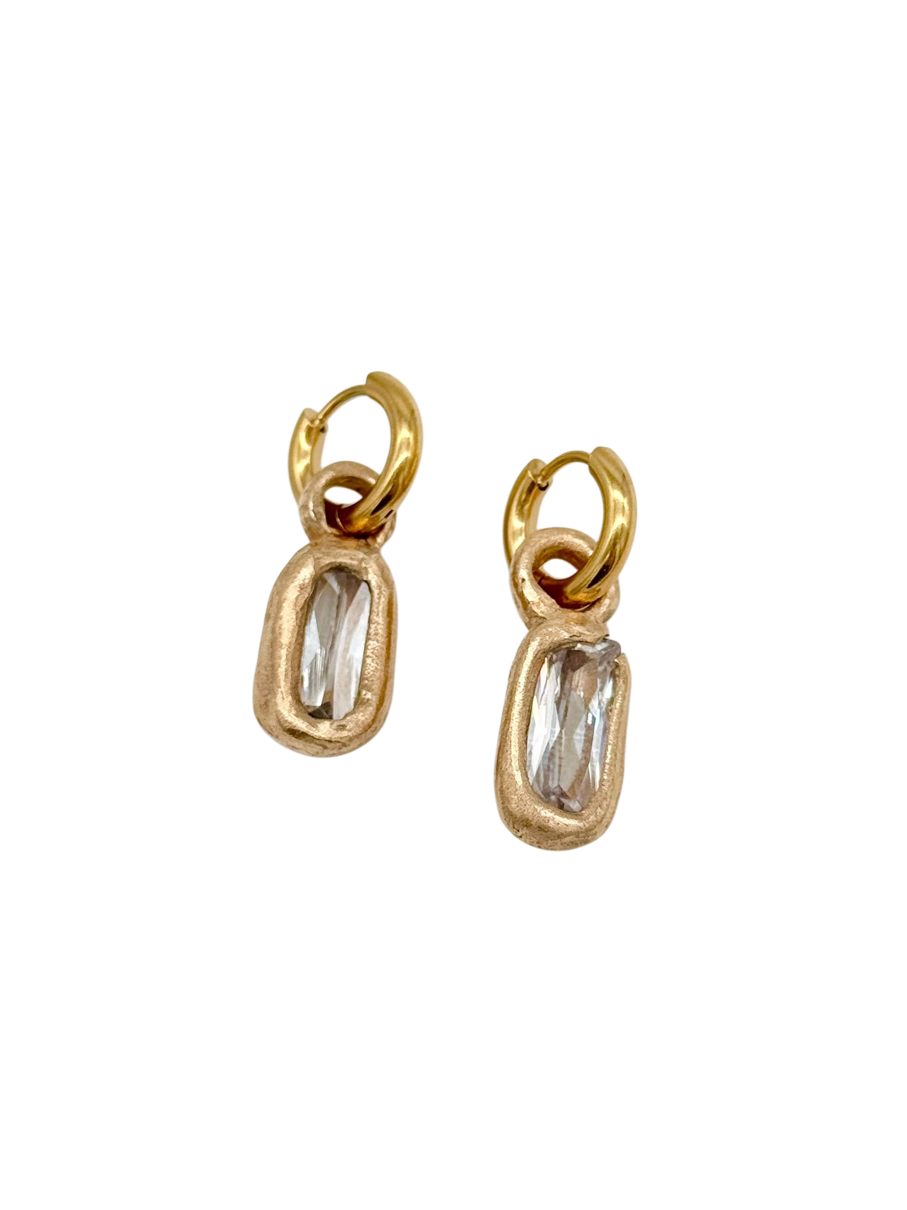 The Rectángulo Earrings are handcrafted in bronze with gold-plated hoops, each adorned with a sleek rectangular lab-created white gem. Their clean lines and bold shape offer a modern touch, while the warm golden finish adds a hint of elegance—perfect for elevating everyday looks with contemporary charm.