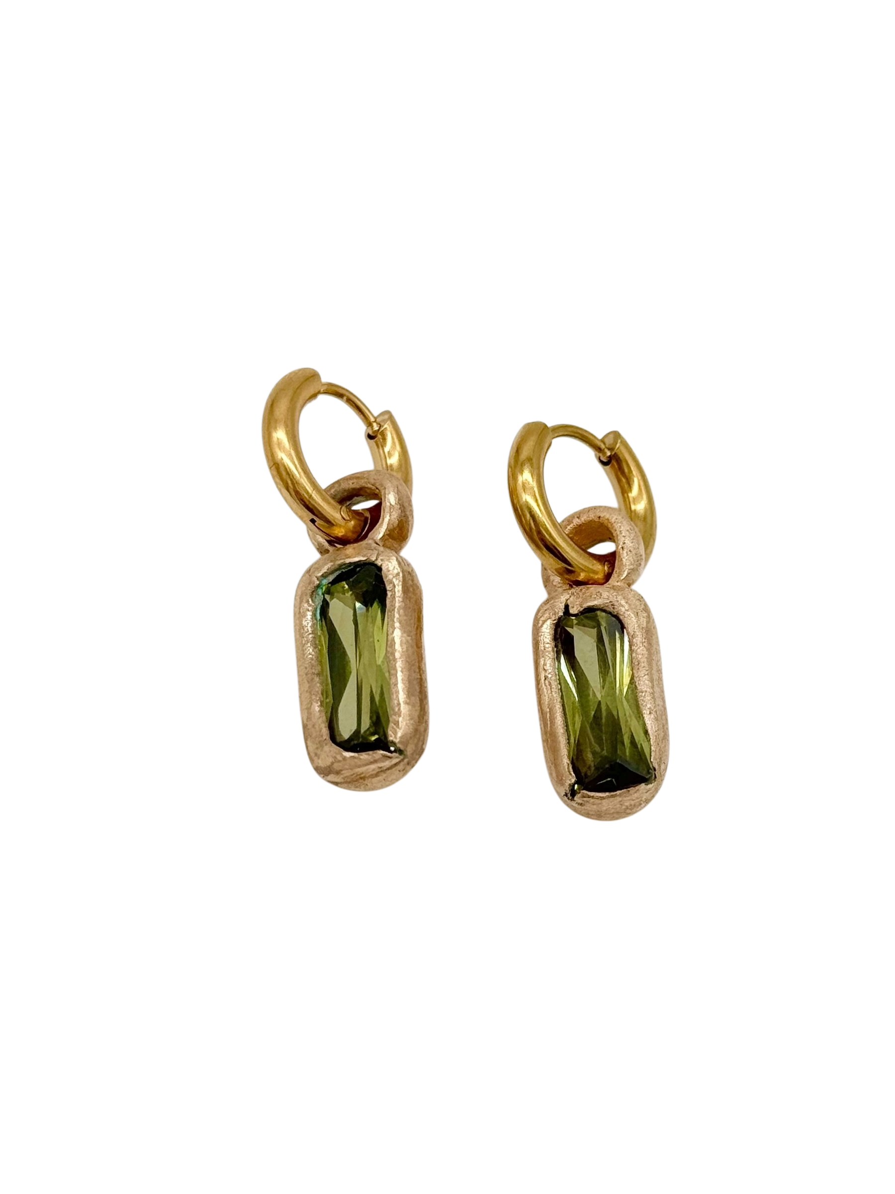 The Rectángulo Earrings are handcrafted in bronze with gold-plated hoops, each adorned with a sleek rectangular lab-created prasiolite. Their clean lines and bold shape offer a modern touch, while the warm golden finish adds a hint of elegance—perfect for elevating everyday looks with contemporary charm.