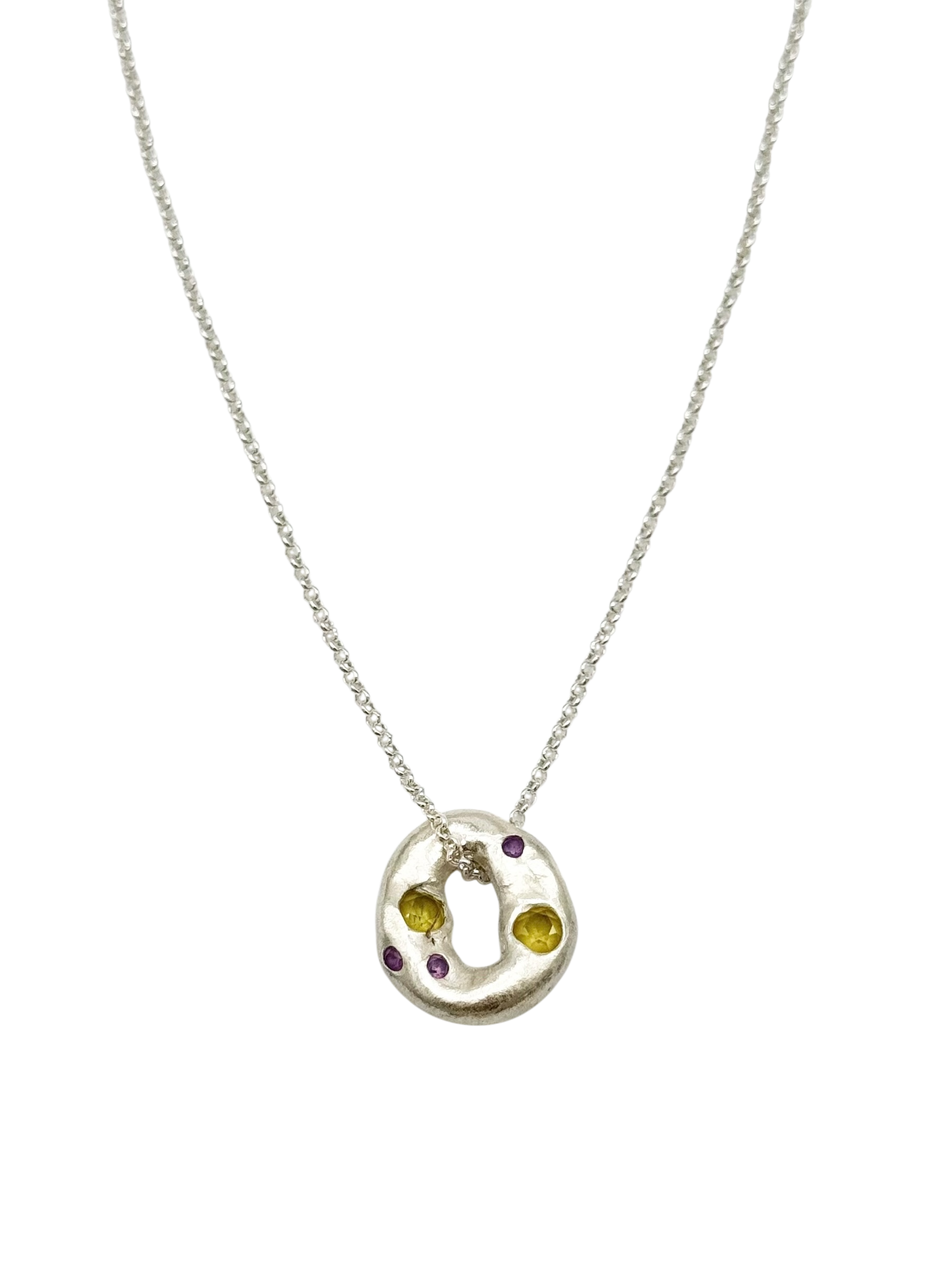 The Rueda Necklace is a delicate, handcrafted piece made from 950 silver. With its elegant round shape and a subtle constellation of small lab-created gems, this pendant captures the beauty of simplicity in motion. Timeless and versatile, it’s a refined accent for everyday wear. Includes a silver chain for a complete and refined look.