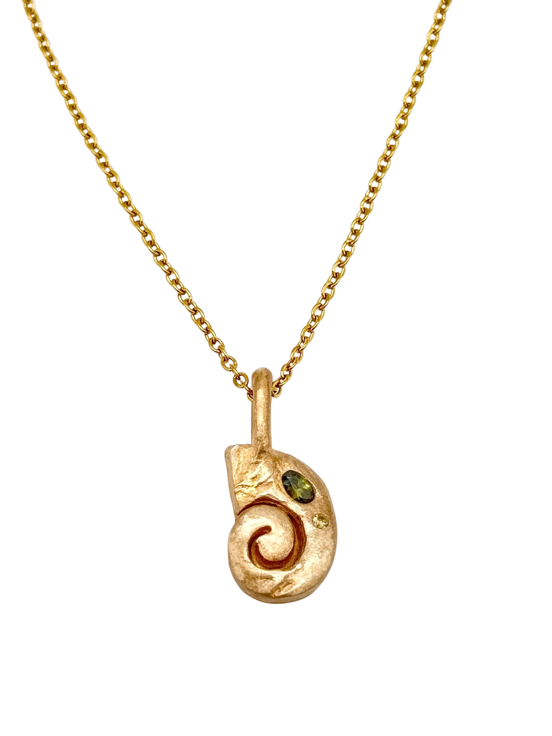 The Sirenita Necklace is a handcrafted bronze piece inspired by the sea, featuring a delicate shell shape adorned with lab-created prasiolites. Its enchanting design captures the spirit of ocean treasures and adds a touch of underwater magic to any look. Includes a chain to complete the piece with elegance and charm.